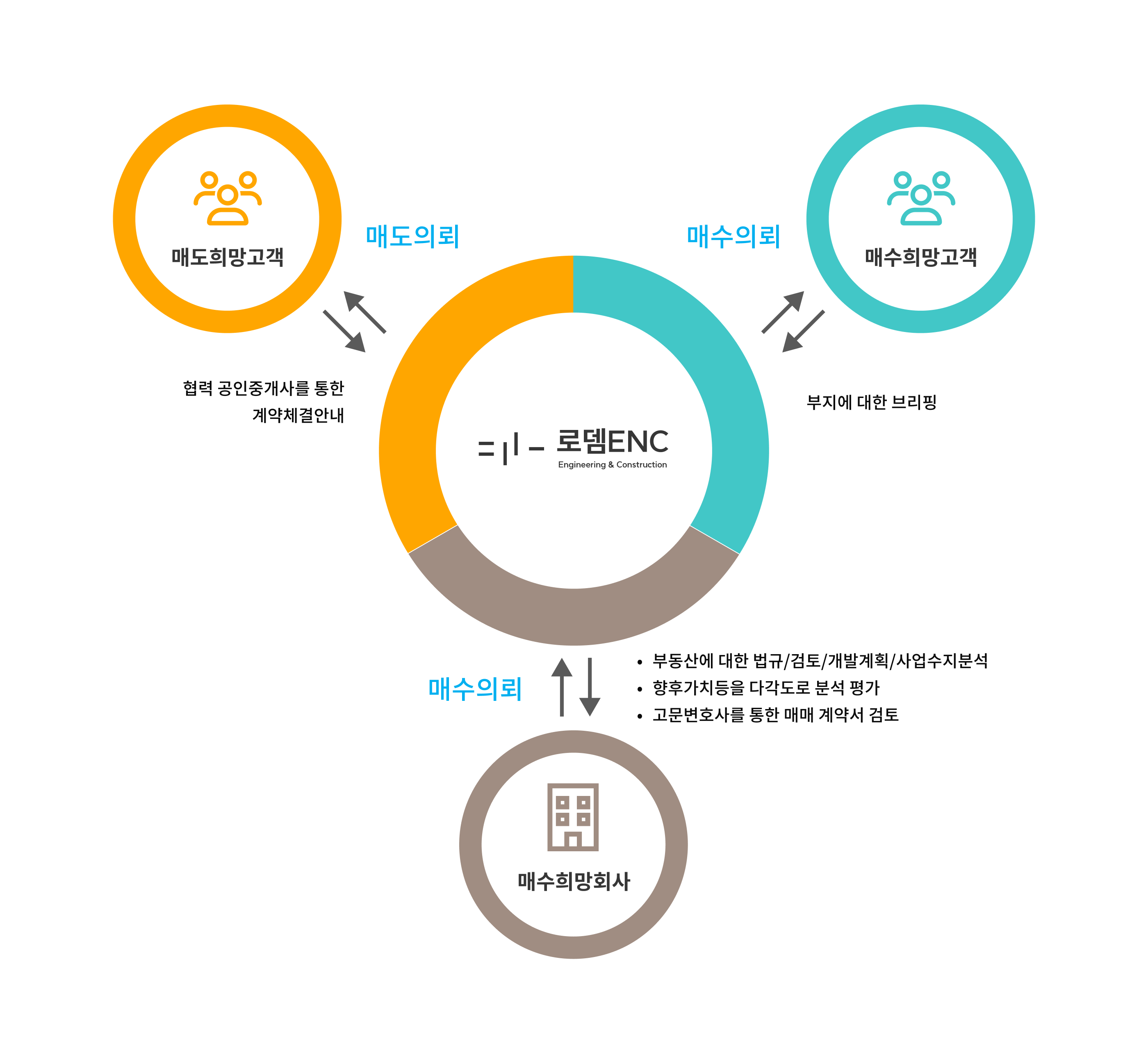 더불어 매입할 토지를 물색하는 고객 또한 당사의 전국각지의 협력 중개업체들과의 협업을 통해 고객의 니즈에 맞는 매수물건을 안내하고 법규검토및 사업수지분석을 지원해드리겠습니다.